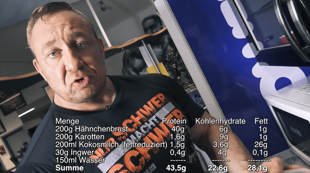Nachdem sein Protein-Muffin anscheinend so gut bei seiner Community ankam, hat sich Markus Rühl für seine neueste Folge von „Markus – der Mixer“ etwas ganz leckeres einfallen lassen: einen Fleisch-Smoothie. Nach reiflicher Überlegung seien er und sein Team auf eine „Kredenz“-Zutat gekommen, die wirklich gut schmeckt, erzählt Markus während er die erste Zutat schon in die Kamera hält. Anschließend zählt Rühl die einzelnen Zutaten auf und schmeißt 30g Ingwer, 200ml Kokosmilch, 200g vorgegartes und ungewürztes Hähnchenbrustfilet und 200g tiefgekühlte Karotten in seinen Mixer. Nachdem alles gut vermischt wurde, wird die entstandene Masse in eine Tupperware gefüllt und nochmal für 2,5 Minuten bei 600 Watt in die Mikrowelle befördert. Natürlich lässt es sich Markus im Anschluss daran nicht nehmen den ersten Löffel zu probieren und meint nur: „Isch brudal…ohne Scheiß jetzt“, sodass spätestens jetzt klar sein dürfte, das der Bodybuilder von dem Rezept echt angetan ist.