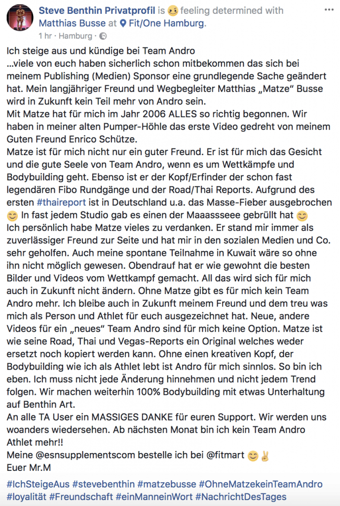 Auf seinem Facebook-Profil verkündete Steve Benthin heute Abend, „dass er aussteige und kündige bei Team Andro“. Als Grund für seine Entscheidung fügte der Bodybuilder den Weggang seines langjährigen Freundes und Wegbegleiters Matthias „Matze“ Busse an, der Ende letzten Monat nach über 10 Jahren Team Andro verließ. So hätte mit „Matze“ 2006 und einem ersten Video alles begonnen. Im Lauf der Jahre hätte sich daraus nicht nur eine tiefe Freundschaft entwickelt, sondern Busse sich gleichzeitig auch zum Gesicht und zur guten Seele von Team Andro in den Bereichen Bodybuilding und Wettkämpfen, schreibt der IFBB Pro in seinem Post.