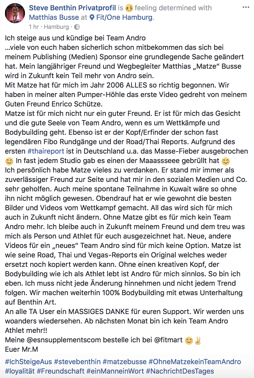 Außerdem, so Steve Benthin weiter, sei Busse der Kopf und Erfinder der Fibo-Rundgänge und Road/Thai Reports gewesen und hätte ihm immer als zuverlässiger Freund zur Seite gestanden und in den sozialen Medien sehr geholfen. Da aber „Matze“ nun nicht mehr „da“ sei, würde es in den Augen von Benthin auch kein Team Andro mehr geben. Des Weiteren sehe er auch in einem „neuen“ Team Andro keine Option für sich, da ein Original wie Busse weder ersetzt noch kopiert werden könne. Zudem wäre Team Andro für ihn ohne eine kreativen Kopf, der Bodybuilding nicht wie er selbst als Athlet leben würde, absolut sinnlos, erklärt der Team Andro-Athlet weiter.