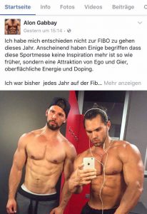 „Ich habe mich entschieden nicht zur FIBO zu gehen dieses Jahr. Anscheinend haben Einige begriffen dass diese Sportmesse keine Inspiration mehr ist so wie früher, sondern eine Attraktion von Ego und Gier, oberflächliche Energie und Doping.