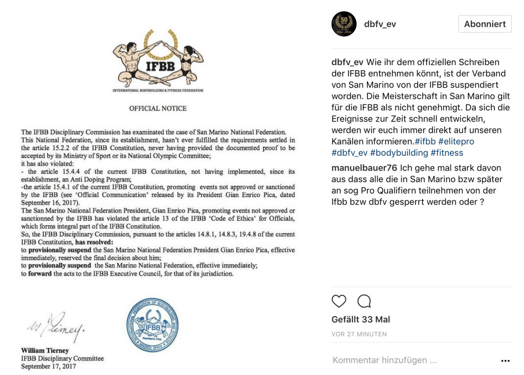 Für die Teilnehmer dürfte das erst einmal ein Schock sein. Viele befürchten sogar, bei einer Teilnahme in San Marino von der IFBB gesperrt zu werden. Ob dies der Fall sein wird, bleibt abzuwarten. Die Athleten haben nun also die Entscheidung zu treffen, ob sie dennoch in San Marino auf der Bühne stehen wollen oder nicht. Logischerweise wird es dort dann keine Chancen auf PRO-Cards geben. Vom deutschen Starterfeld dürfte hier insbesondere Tim Budesheim betroffen sein, der sich extra für den Wettkampf in San Marino entschieden hat. Ob er diesen nach den aktuellen Neuigkeiten auch antritt, ist fraglich.