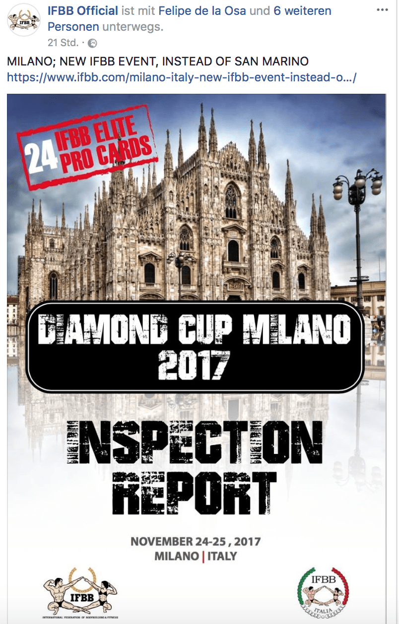 Um die Endgültigkeit dieser Entscheidung noch zu verstärken, hat die IFBB zeitgleich verkündet, dass sie einen anderen Wettkampf zur exakt selben Zeit veranstalten wird. Dieser wird der erste DIAMOND CUP in Mailand sein. Dort wird es dann auch die Möglichkeit auf PRO-Cards geben. Pro Klasse verteilt der Verband demnach drei Profi-Lizenzen. Höchst wahrscheinlich werden sich die Teilnehmer für San Marino also dann eher für die Meisterschaft in Mailand entscheiden. Wir sind gespannt auf ein Statement von Tim Budesheim zu dem Ganzen!