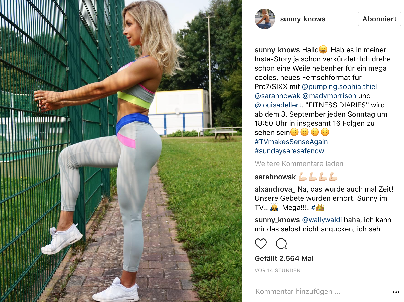Eigentlich hat YouTube das Fernsehen ja fast schon überholt. Zumindest gibt es immer mehr Menschen, die sich lieber Videos ihrer Lieblings-Videomacher ansehen, als irgendeine TV-Show. Das soll sich mit dem neuen Fernsehformat von Pro7/SIXX wohl ändern. Der TV-Sender hat sich jetzt nämlich einige beliebte Influencer an Bord geholt und ein neues Serienkonzept entwickelt. Darin zu sehen ist (man hätte es sicher nicht anders erwartet) Sophia Thiel. Doch sie ist nicht die Einzige. Mit ihr sollen bei den „Fitness Diaries“ auch Female+ Athletin Sunnyknows, Sarah Nowak, Fittrito-Gründerin Louisa Dellert und Mady Morrison zu sehen sein. Diese Ankündigung hat gestern zumindest auch Sunny auf ihrem Instagram-Profil verkündet.