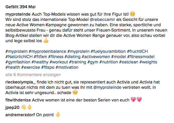 Die Schönheit hatte bei GNTM zwar „nur“ den zweiten Platz gemacht, ihre Karriere lief anschließend trotzdem hervorragend. Mittlerweile ist sie seit gut drei Jahren bei Taff, moderierte zahlreiche TV Shows und ist auch weiterhin als Model erfolgreich. Dementsprechend arbeitet sie natürlich auch für andere Marken. Seit diesem Jahr ist sie unter anderem für Activia tätig. Genau das scheint bei MyProtein Fans nicht ganz so gut anzukommen. So wurde unter dem Foto mit der Verkündung, dass Rebecca Mir das neue Gesicht der Active Women Linie ist, sofort Kritik geäußert. Demnach sei Activia ungesund und habe nichts mit dem zu tun, was MyProtein vertreten wolle.