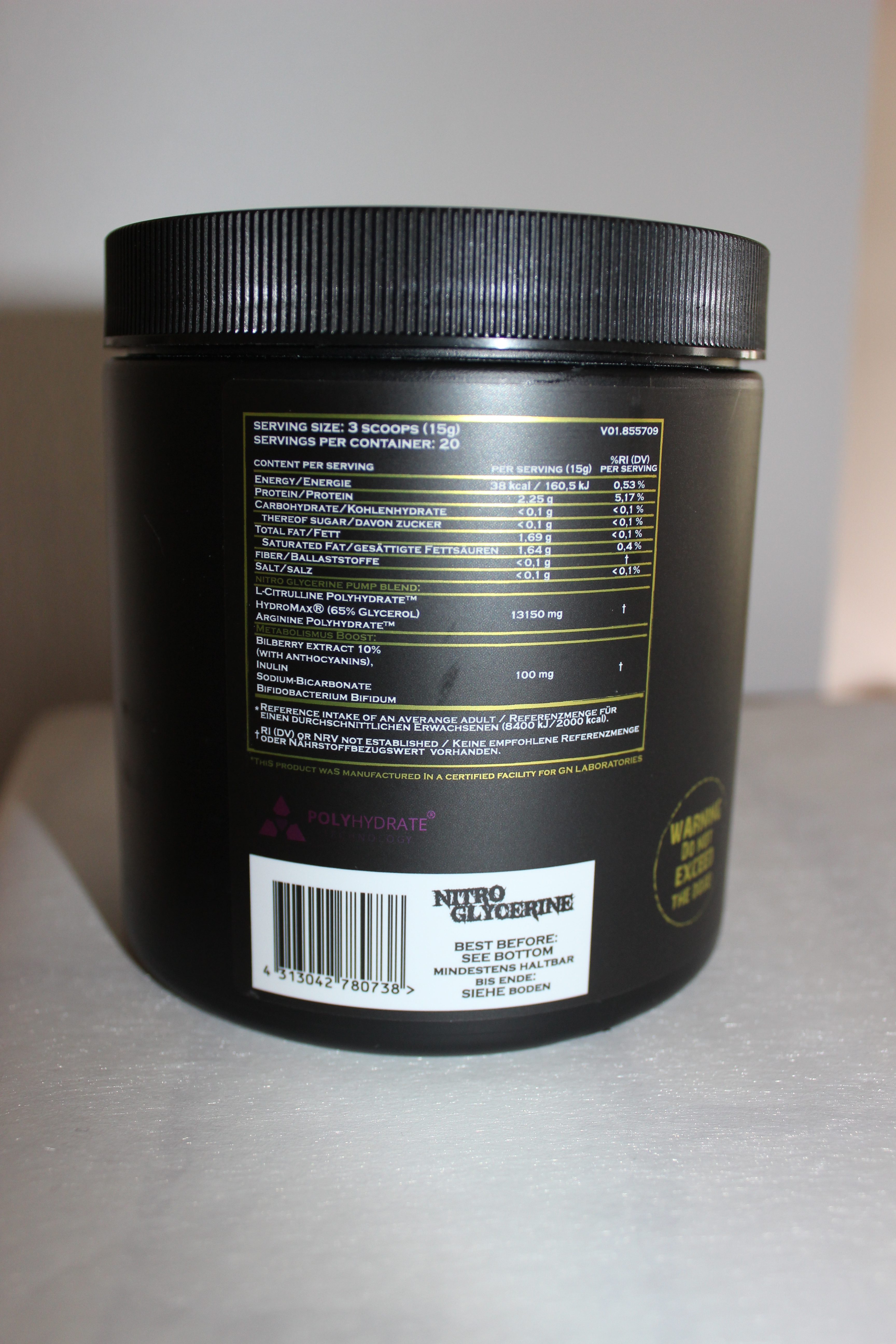 GN’s Pump Booster setzt sich insgesamt aus zwei „Blends“ zusammen. In der „Nitro Glycerine Pump Blend“ findet ihr alt bekannte Zutaten wieder. So setzt sich die Formel aus den beliebten Stickstoffoxyd-Boostern Arginin Polyhydrate™ und Citrulline Polyhydrate™, sowie dem Pump Inhaltsstoff Hydromax™ zusammen. Die „Metabolismus Boost Blend“ beinhaltet Bilberry Extrakt, Inulin und Sodium-Bicarbonat. Wie es sich für einen amerikanischen Hersteller gehört, hat GN hierbei die genaue Zusammensetzung als „proprietary blend“ verschleiert. Genaue Grammangaben der einzelnen Inhaltsstoffe findet ihr demzufolge nicht.