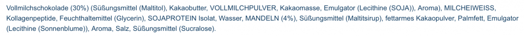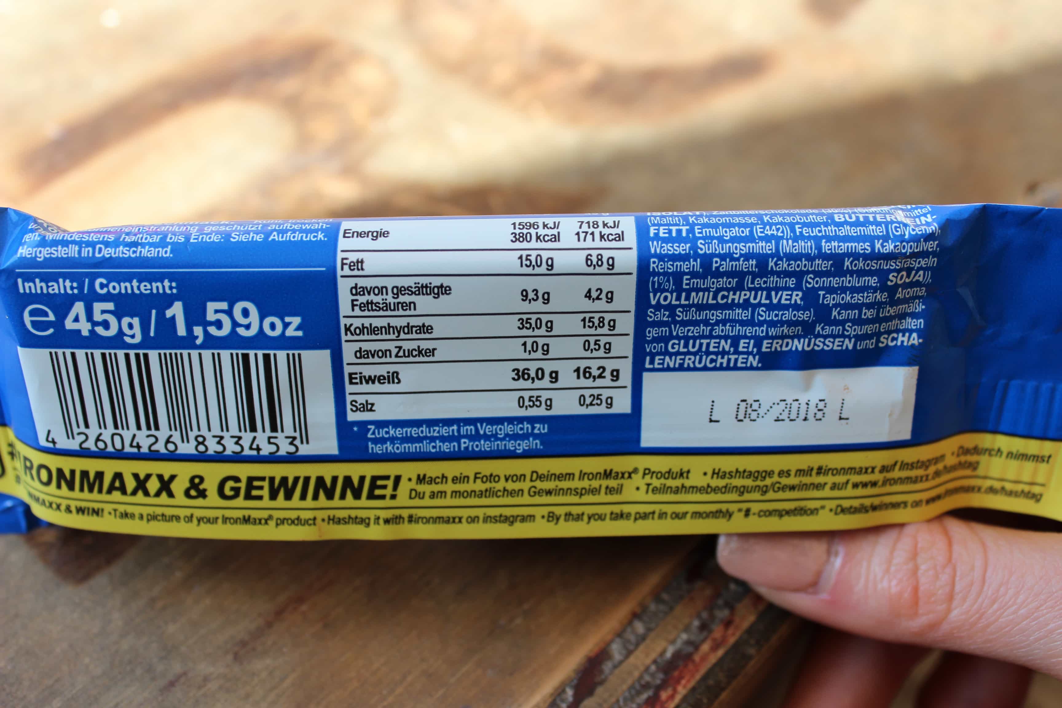 Was die Zusammensetzung der Proteine angeht, setzt IronMaxx auf insgesamt drei „Quellen“. Als erstes aufgeführt und somit den Großteil ausmachend ist das Milchprotein, gefolgt von Kollagenpeptiden an zweiter Stelle und Sojaprotein als dritte und letzte Proteinquelle. In welchen Mengen und Verhältnis wird jedoch nicht ersichtlich, da sich die genau Zusammensetzung hinter einer sogenannten „Proprietary Blend“ versteckt. Während Milch- und Sojaprotein definitiv zu den muskelaufbauenden Proteinen gezählt werden können, eignen sich die auf den Muskelaufbau nur äußert gering auswirkenden Kollagenpeptide hervorragend für den Wiederaufbau der Gelenke. Für die Kohlenhydrate und Fette „sorgen“ größtenteils Zartbitterschokolade (die 30% des Riegels ausmacht), Kakao in den unterschiedlichsten „Formen“, natürliches Butterreinfett, Palmfett und Reismehl. Mit 16,2g Protein, 15,8g Kohlenhydrate (davon 0,5g Zucker), und 6,8g Fett (4,2g davon gesättigt) schlägt ein 45g schwerer Riegel mit insgesamt 171 Kalorien zu Buche. Die Mengenangaben der Zuckeralkohole und Ballaststoffe sind auf der Nährwerttabelle nicht angegeben und somit eine vollständige Transparenz nicht vorhanden.