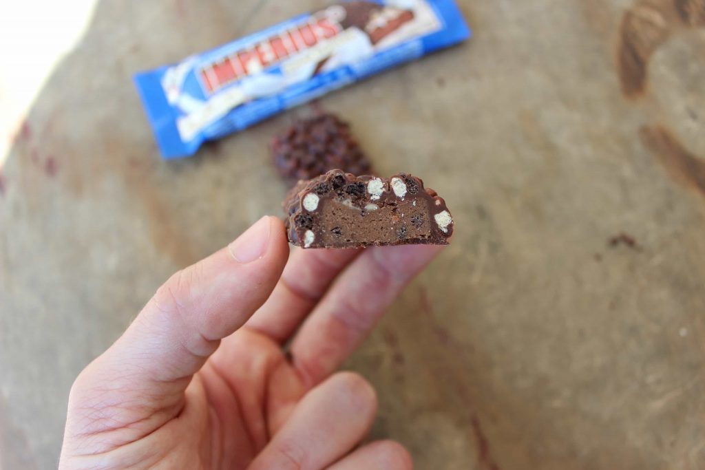 Bei der Konsistenz des Imperius ist der Name „Crunch“ definitiv Programm und lässt sich am besten mit „knusprige Schale, weich-knuspriger Kern“ beschreiben. Vor allem die in dem Riegel enthalten knusprigen Stückchen sorgen den speziellen „Knuspereffekt“. Trotz der Knusperstückchen bleibt die „Softheit“ erhalten und der Riegel wirkt unglaublich soft und cremig – ohne dabei zu trocken zu sein.