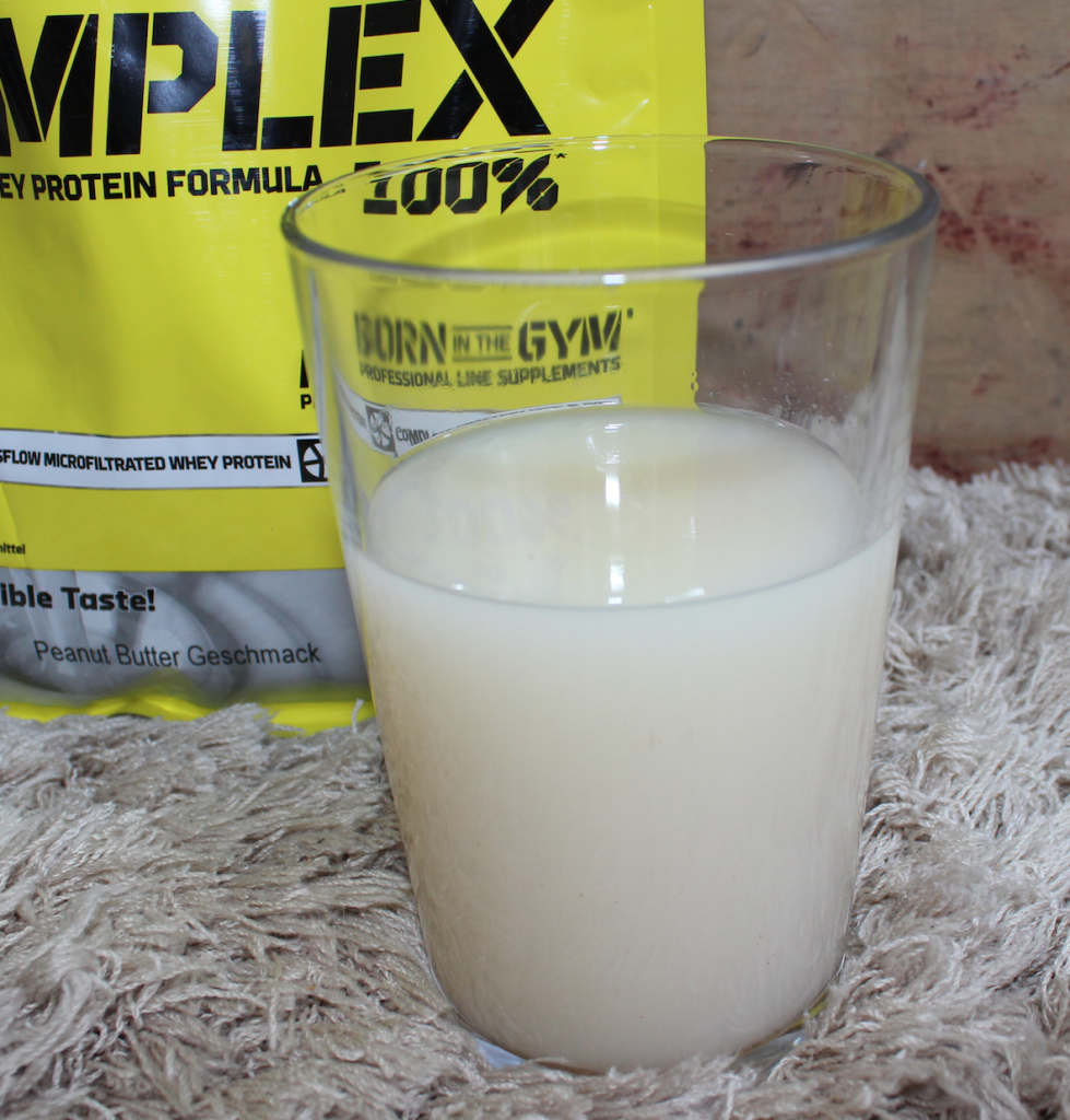 Ähnlich wie bei Salzkaramell, steigt uns auch bei der Sorte Erdnussbutter beim ersten Öffnen der Verpackung ein intensiver Duft entgegen. Erdnussbutter Fans werden bestimmt direkt verliebt sein. Dementsprechend waren natürlich auch unsere Erwartungen groß, wie das Pulver in Wasser gelöst schmecken wird. Hierbei sollte man vorab erwähnen, dass es nicht unbedingt einfach ist einen authentischen Erdnussgeschmack als Proteinpulver zu entwickeln. Aus diesem Grund gibt es, vor allem in Europa, noch nicht viele Hersteller, die die Sorte überhaupt im Sortiment haben. Unsere Tests waren bislang leider auch eher enttäuschend. Nachdem der Geruch bei OLIMP ja schonmal vielversprechend war, hat uns tatsächlich auch der Geschmackstest überzeugt. Wer Erdnussmehl oder PB2 kennt, der darf sich das an dieser Stelle mit erheblich mehr Süße und natürlich mit Wasser vermengt vorstellen. Genau so schmeckt der Erdnussgeschmack des Whey Protein Complex! Allerdings wollen wir an dieser Stelle anmerken, dass dieser intensive Geschmack auch nur bei einer eher geringen Wassermenge der Fall ist. Wie vom Hersteller angegeben, sind 35g in 100-200ml ideal für einen geschmackvollen Shake. Wer sein Eiweiß lieber mit mehr Wasser trinkt, muss entweder mehr Pulver nehmen oder mit einem „verdünntem“ Geschmack leben.